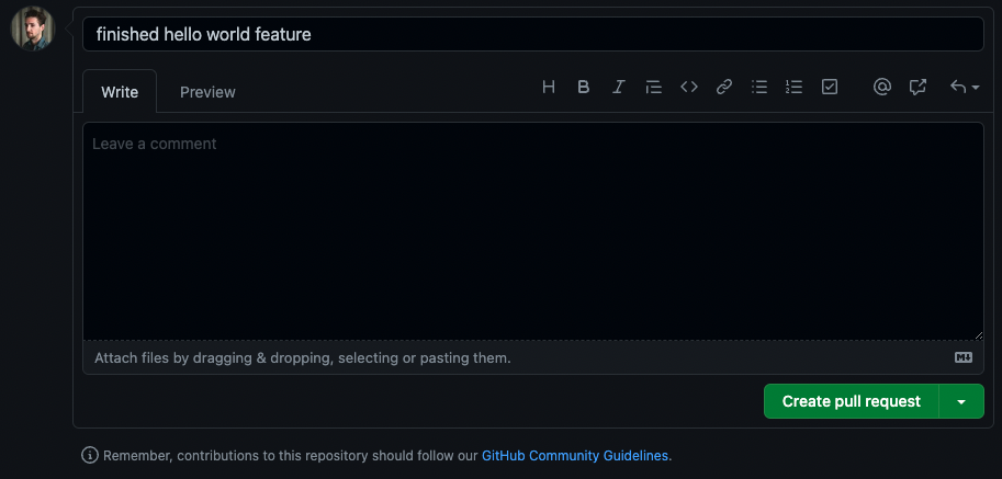 git commit -m "finished hello world feature"git push --set-upstream origin feature-helloworldgit checkout main
