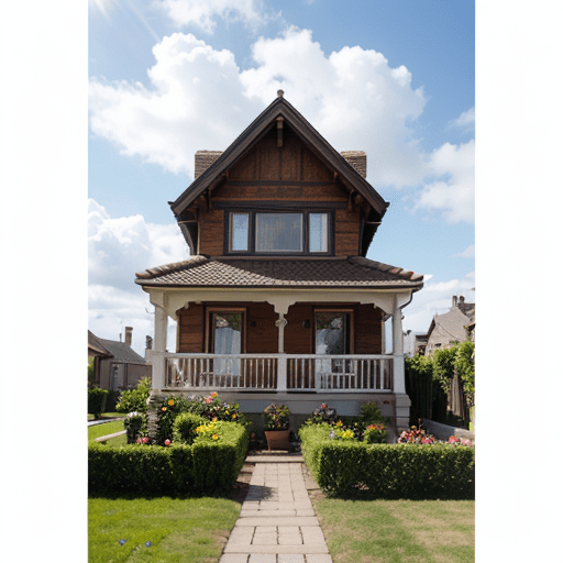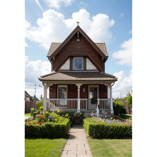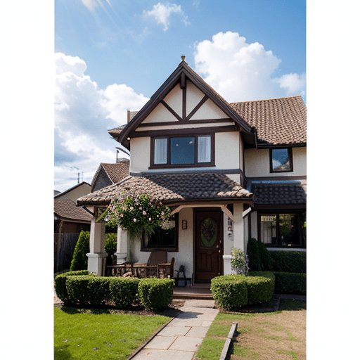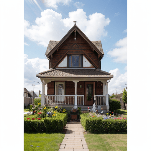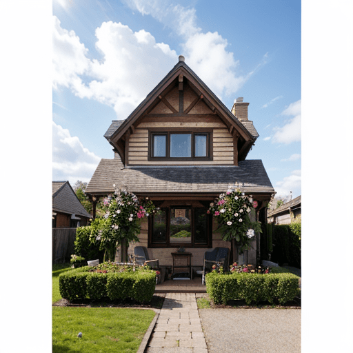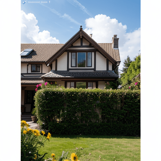 photorealistic picture of a house, front garden, flowers, sunny day, clouds in the sky, photographed on a Fujifilm GFX 100S, 80mm lens, F1.7, masterpiece, best quality, 4k, high-res, masterpiece, best quality, sharp focus, (cinematic lighting), dynamic angle, Canon 5D, 50mm f/1.8, ISO 320