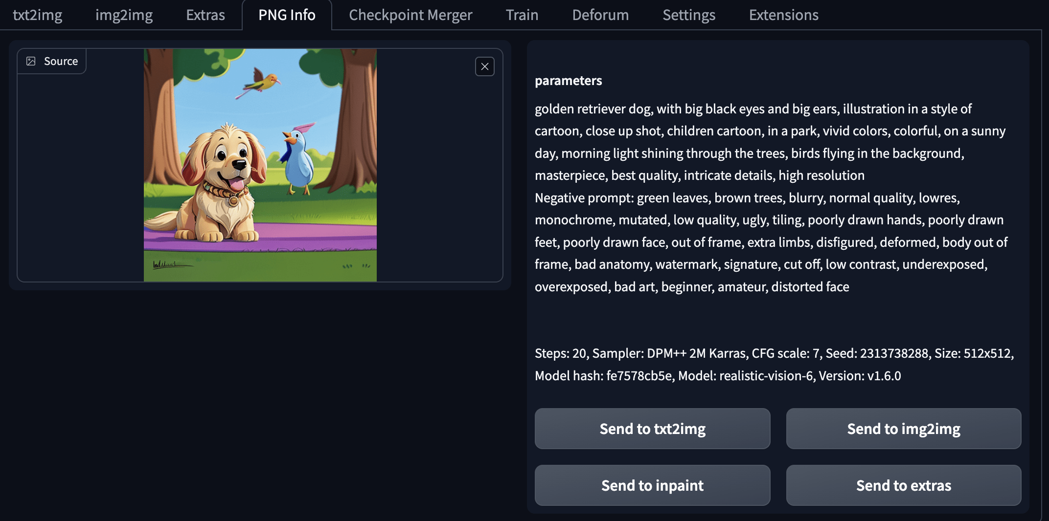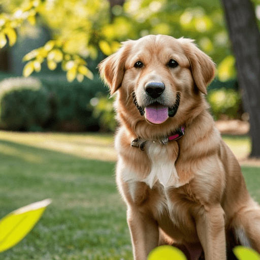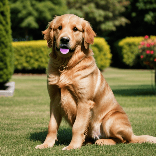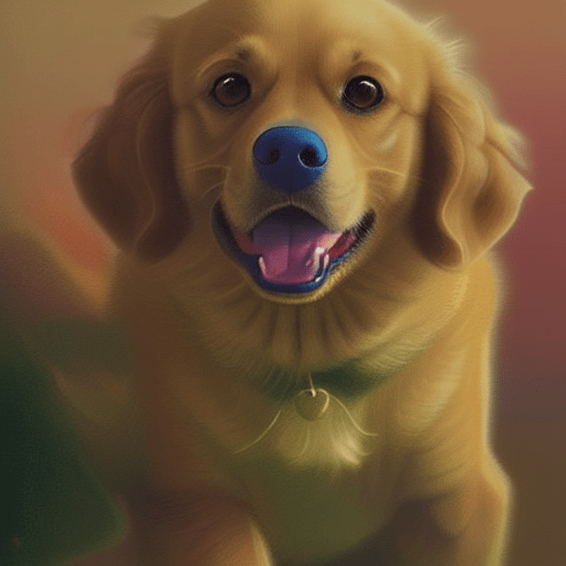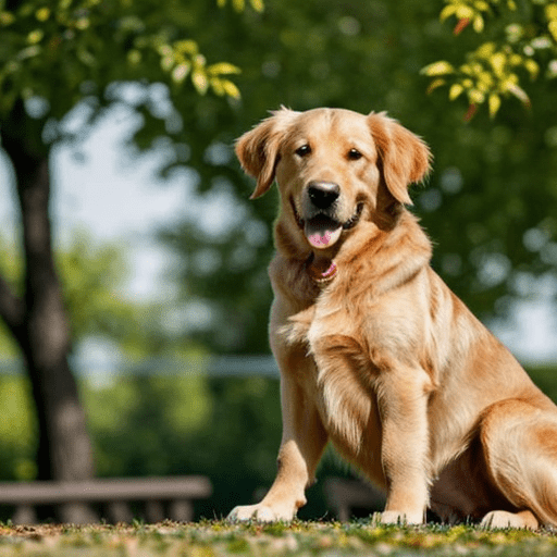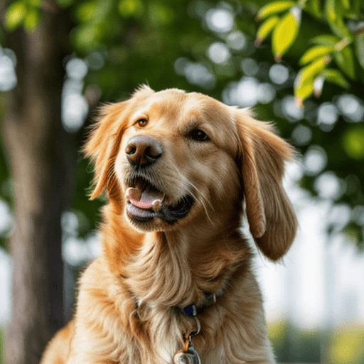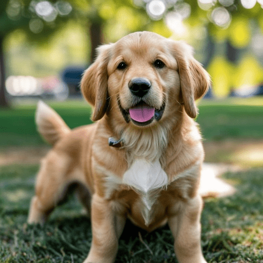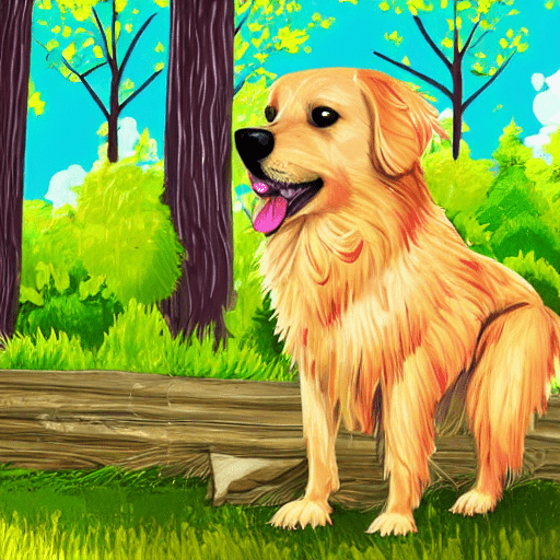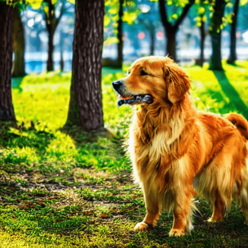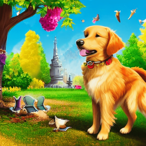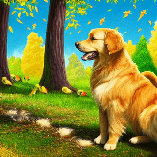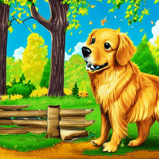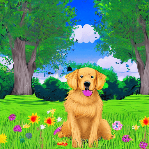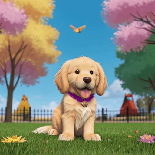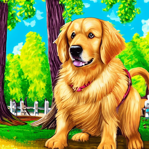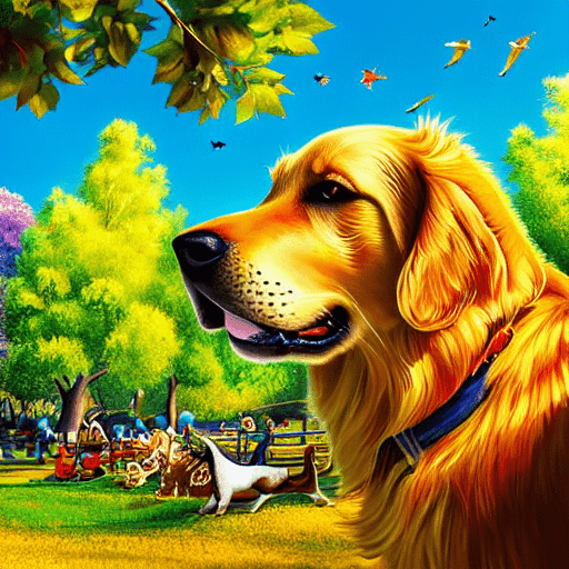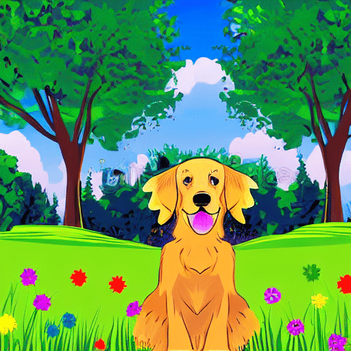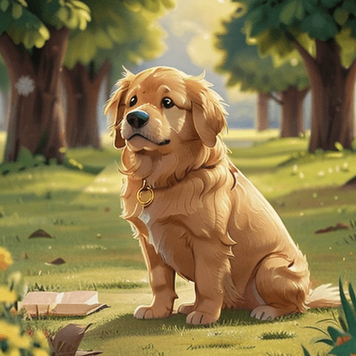 golden retriever dog, with big black eyes and big ears, illustration in a style of cartoon, close up shot, children cartoon, in a park, vivid colors, colorful, on a sunny day, morning light shining through the trees, birds flying in the background, masterpiece, best quality, intricate details, high resolution