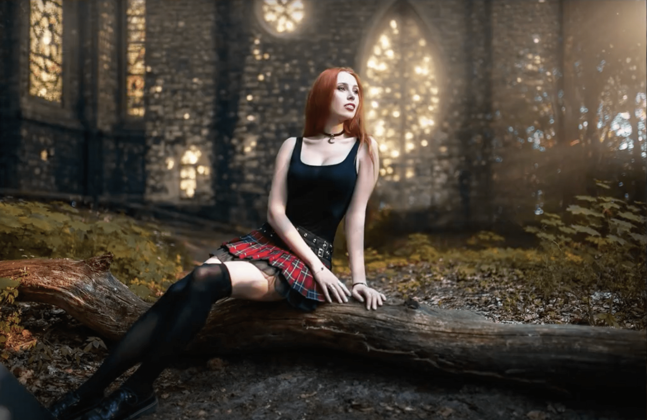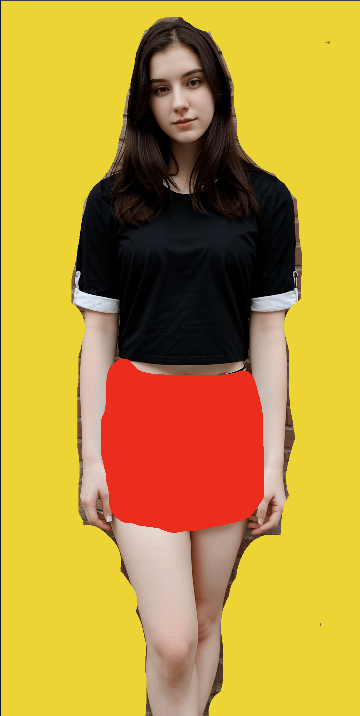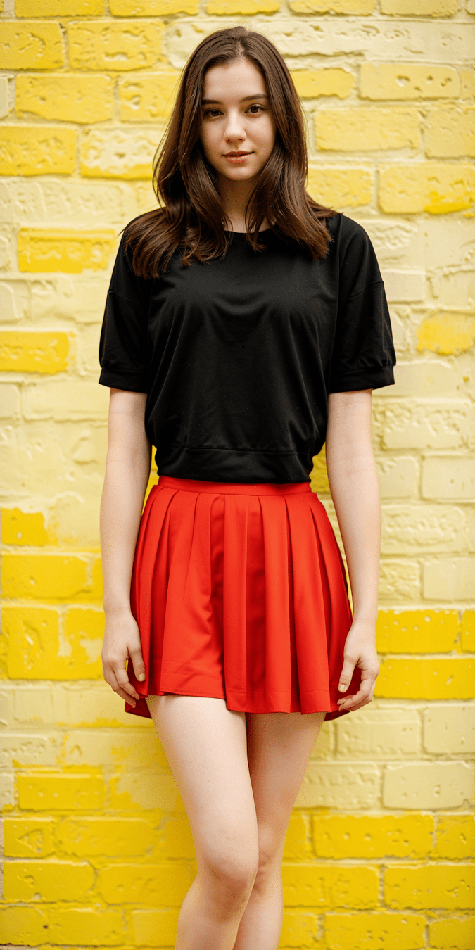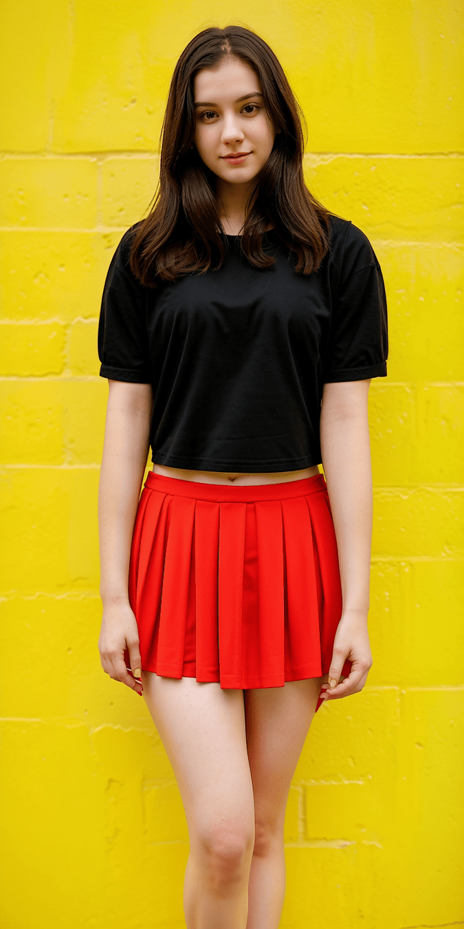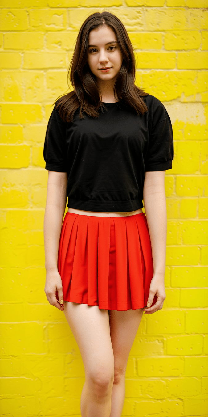 photo of 24 y.o woman standing in front of a yellow brick wall, pale skin, red skirt