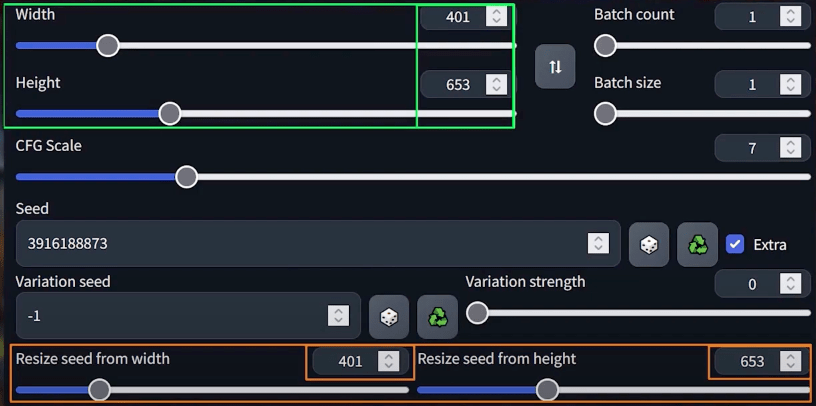 De afbeeldingsgrootte aanpassen met dezelfde prompt en zelfde seed heeft invloed op je afbeelding.