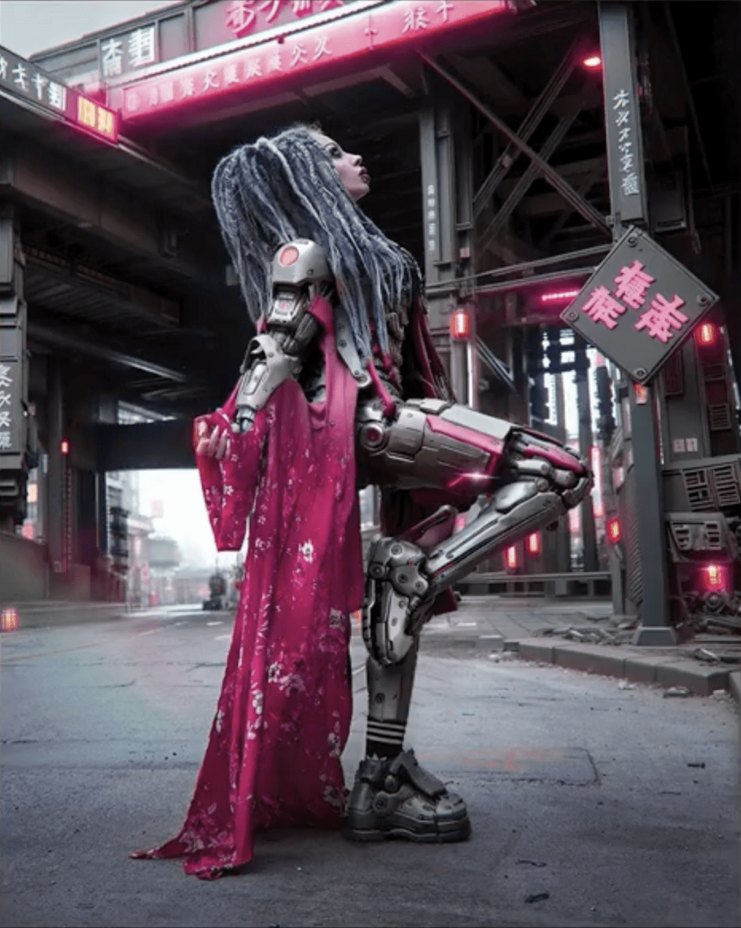 pavement, rain reflections, dark brooding atmosphere, urban samurai, chinatown, (cybernetic