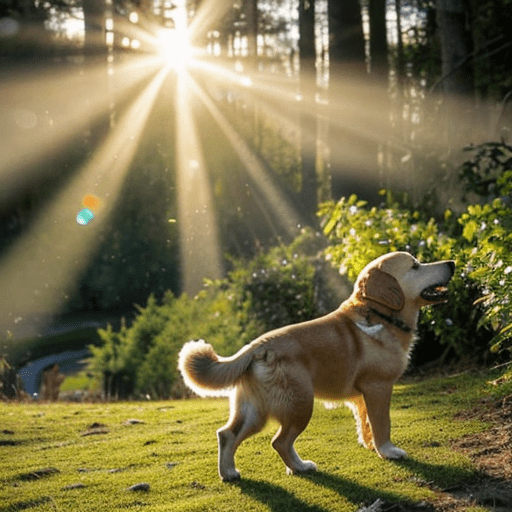 macro perspective of a dogs nose, golden retriever dog, with big black eyes and big ears, illustration in a style of cartoon, children cartoon, in a park, vivid colors, colorful, on a sunny day, morning light shining through the trees, a flock of birds, masterpiece, best quality, intricate details, high resolution
