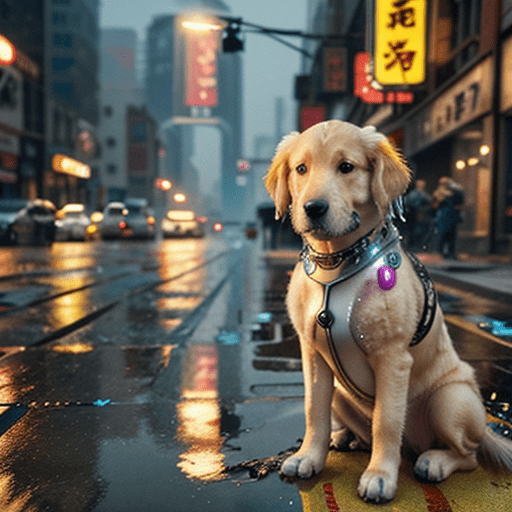 closeup frame of a golden retriever dog in (Cyberpunk 2077 style:1.2), (dog:1.2), wet
