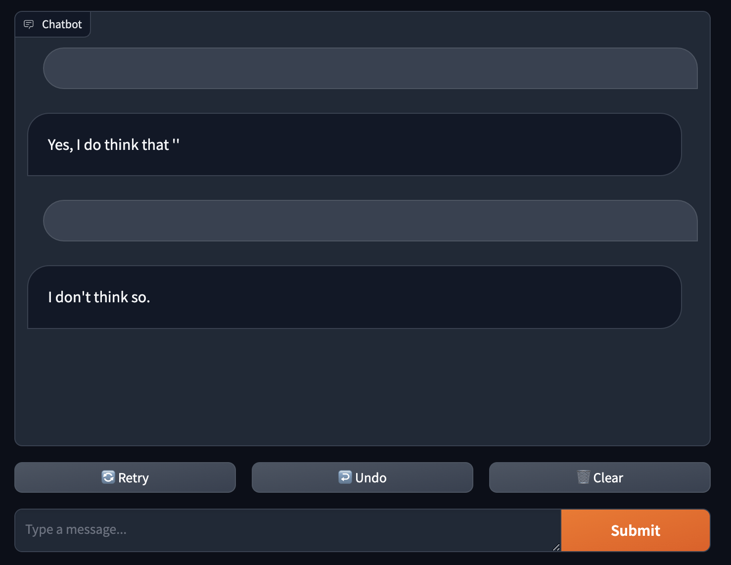 Chatbots are a popular application of large language models. Using gradio, you can easily build a demo of your chatbot model and share that with your users, or try it yourself using an intuitive chatbot UI.