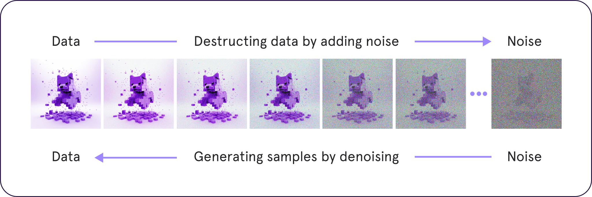 • Diffusion models beginnen met "ruwe" trainingsgegevens en leren om noise te verwijderen